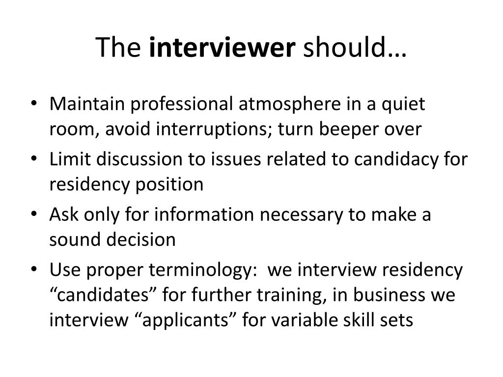 The interviewer should… • Maintain professional atmosphere in a quiet room, avoid interruptions; turn beeper over • Limit discussion to issues related to candidacy for residency position • Ask only for information necessary to make a sound decision • Use proper terminology: we interview residency “candidates” for further training, in business we interview “applicants” for variable skill sets