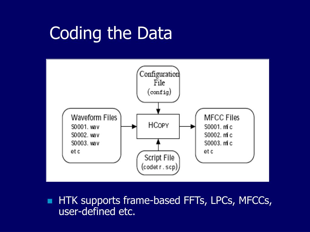 Coding the Data • HTK supports frame-based FFTs, LPCs, MFCCs, user-defined etc.