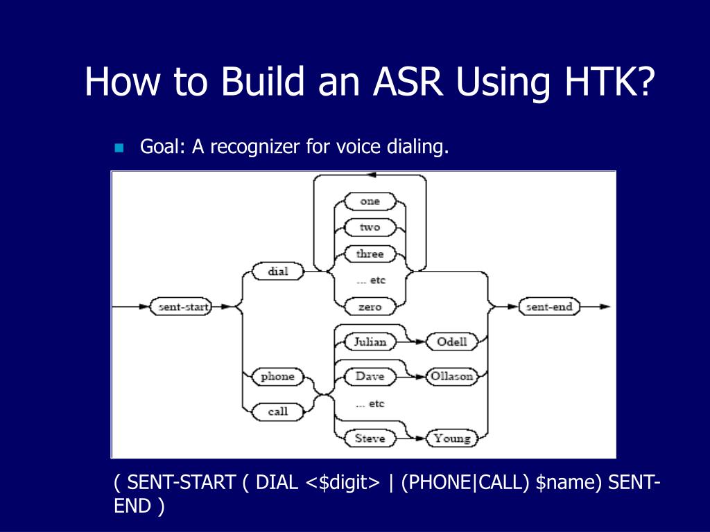 How to Build an ASR Using HTK? • Goal: A recognizer for voice dialing. ( SENT-START ( DIAL <$digit> | (PHONE|CALL) $name) SENT-END )