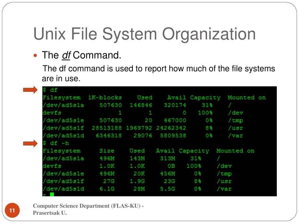 Unix File System Organization • The df Command. The df command is used to report how much of the file systems are in use. Computer Science Department (FLAS-KU) - Prasertsak U.