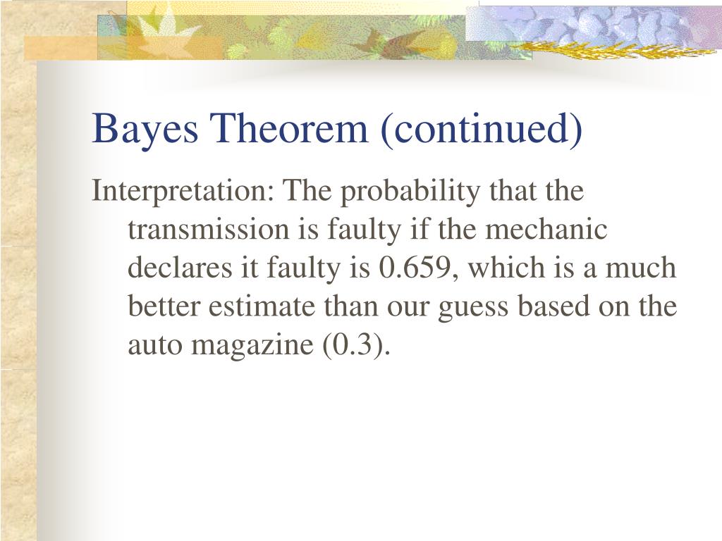 Bayes Theorem (continued) Interpretation: The probability that the transmission is faulty if the mechanic declares it faulty is 0.659, which is a much better estimate than our guess based on the auto magazine (0.3).