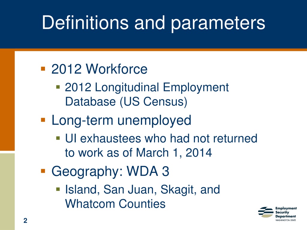 Definitions and parameters • 2012 Workforce • 2012 Longitudinal Employment Database (US Census) • Long-term unemployed • UI exhaustees who had not returned to work as of March 1, 2014 • Geography: WDA 3 • Island, San Juan, Skagit, and Whatcom Counties