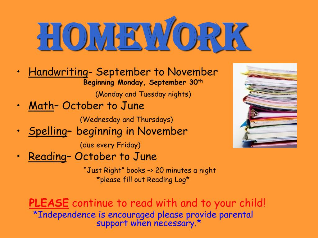 Homework • Handwriting- September to November Beginning Monday, September 30th (Monday and Tuesday nights) • Math– October to June (Wednesday and Thursdays) • Spelling– beginning in November (due every Friday) • Reading– October to June “Just Right” books –> 20 minutes a night *please fill out Reading Log* PLEASE continue to read with and to your child! *Independence is encouraged please provide parental support when necessary.*