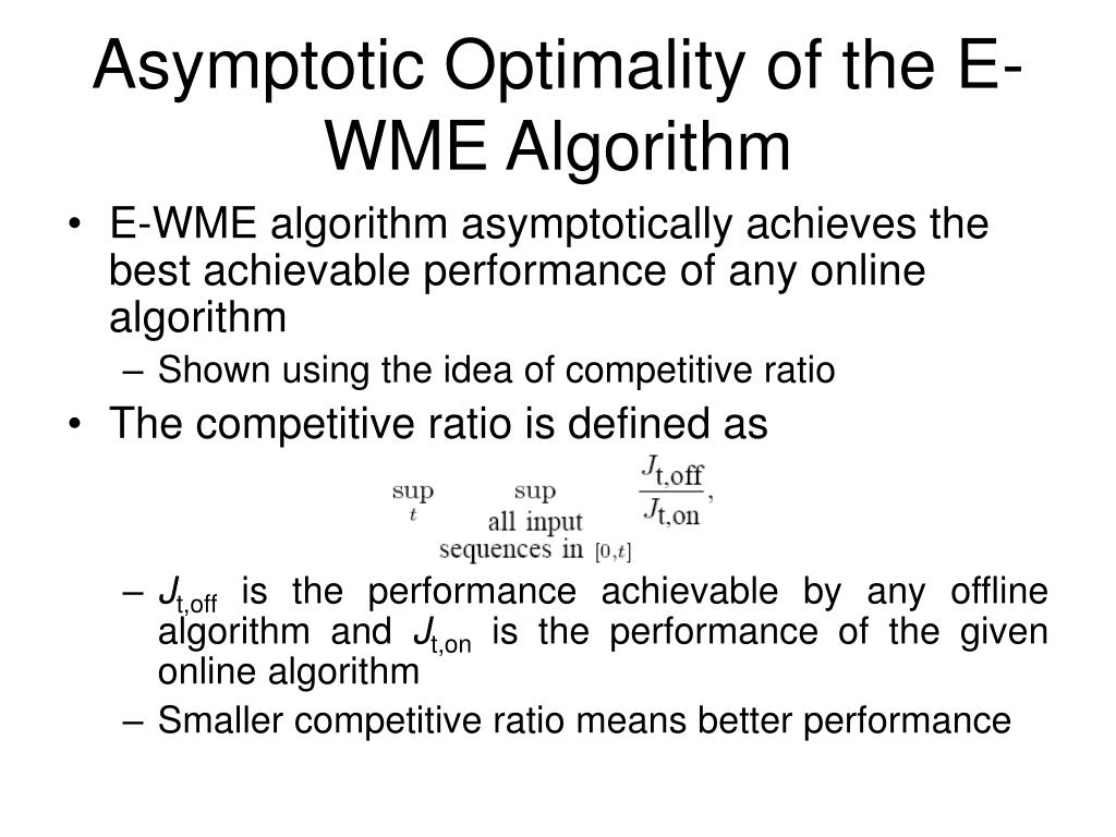Asymptotic Optimality of the E-WME Algorithm • E-WME algorithm asymptotically achieves the best achievable performance of any online algorithm • Shown using the idea of competitive ratio • The competitive ratio is defined as • Jt,off is the performance achievable by any offline algorithm and Jt,on is the performance of the given online algorithm • Smaller competitive ratio means better performance