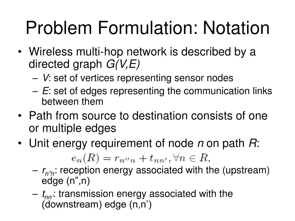 Problem Formulation: Notation • Wireless multi-hop network is described by a directed graph G(V,E) • V: set of vertices representing sensor nodes • E: set of edges representing the communication links between them • Path from source to destination consists of one or multiple edges • Unit energy requirement of node n on path R: • rn”n: reception energy associated with the (upstream) edge (n”,n) • tnn’: transmission energy associated with the (downstream) edge (n,n’)