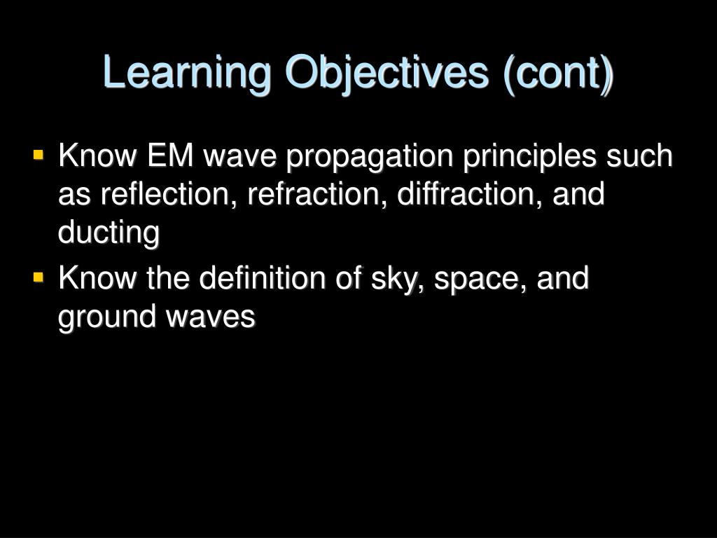 Learning Objectives (cont) • Know EM wave propagation principles such as reflection, refraction, diffraction, and ducting • Know the definition of sky, space, and ground waves