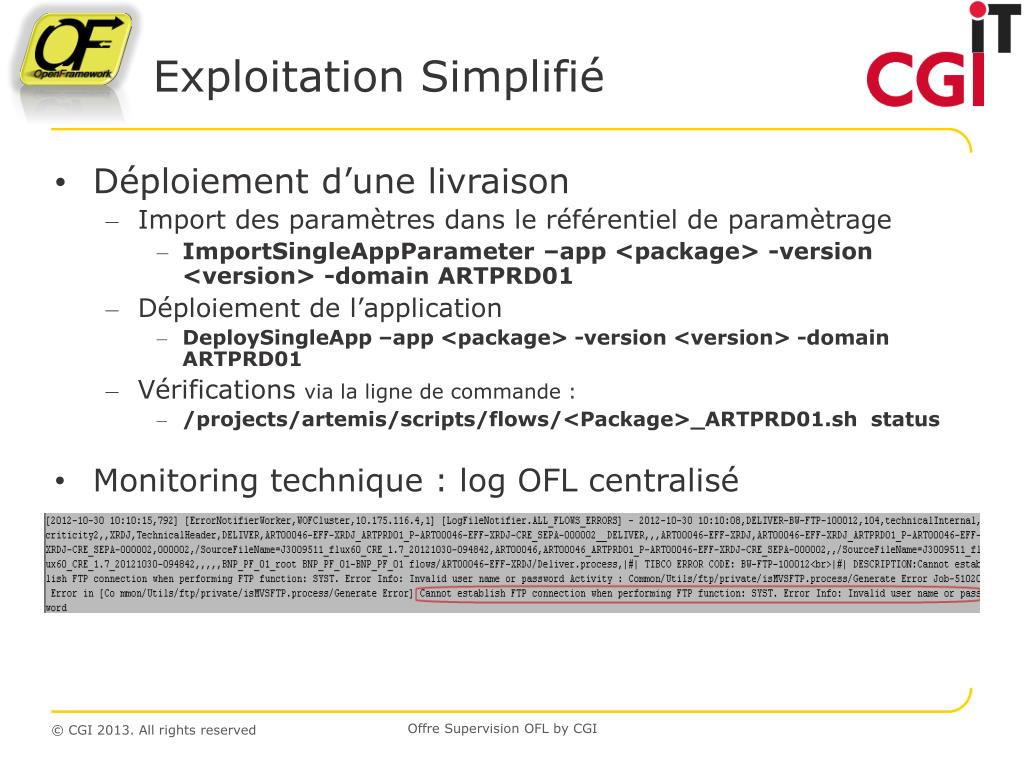 Déploiement d’une livraison Import des paramètres dans le référentiel de paramètrage ImportSingleAppParameter –app <package> -version <version> -domain ARTPRD01 Déploiement de l’application DeploySingleApp –app <package> -version <version> -domain ARTPRD01 Vérificationsvia la ligne de commande : /projects/artemis/scripts/flows/<Package>_ARTPRD01.sh status Monitoring technique : log OFL centralisé Exploitation Simplifié