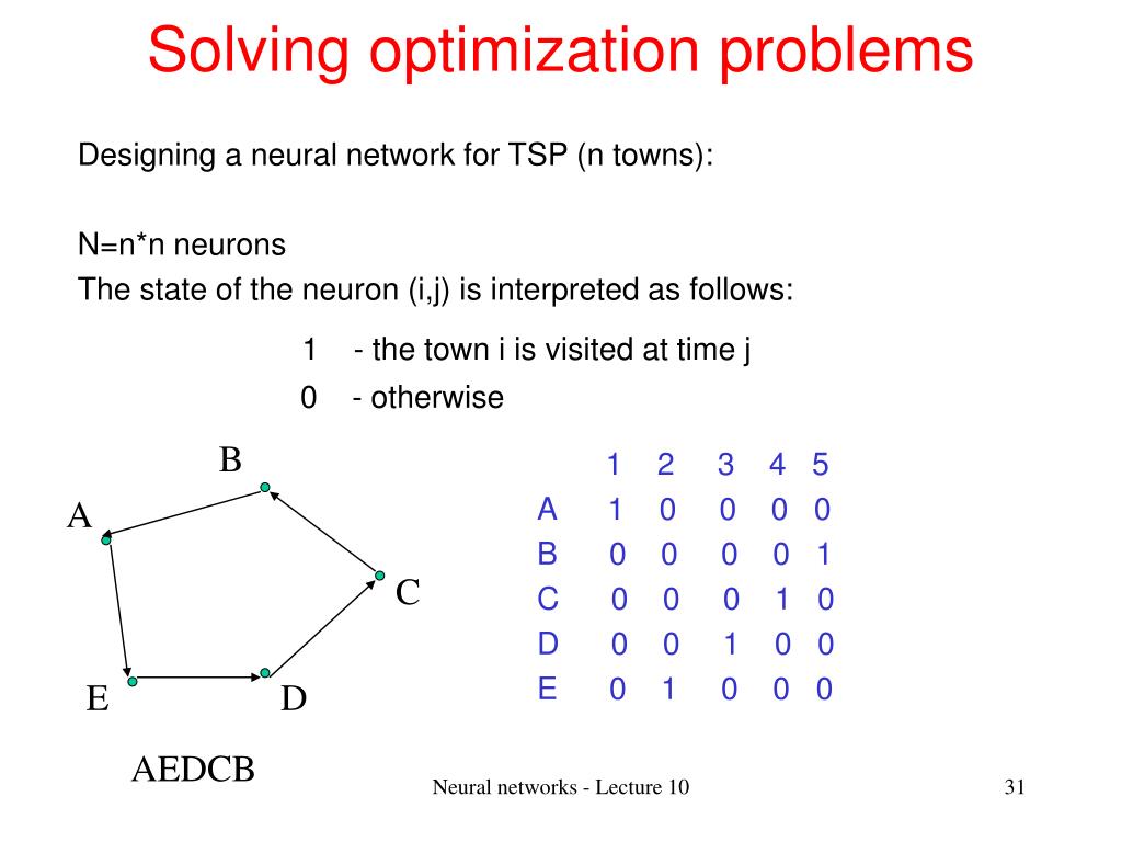 Solving optimization problems 1 2 3 4 5 A 1 0 0 0 0 B 0 0 0 0 1 C 0 0 0 1 0 D 0 0 1 0 0 E 0 1 0 0 0 Constraints: - at a given time only one town is visited (each column contains exactly one value equal to 1) - each town is visited only once (each row contains exactly one value equal to 1) Cost function: the tour length = sum of distances between towns visited at consecutive time moments Neural networks - Lecture 10