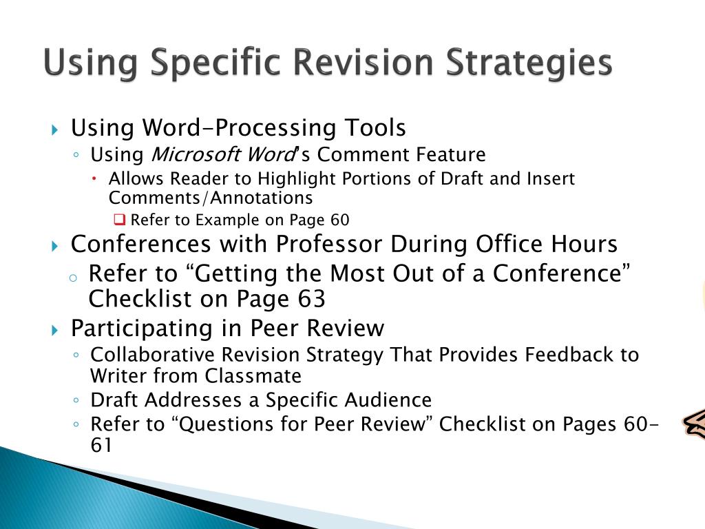 Using Specific Revision Strategies • Using Word-Processing Tools • Using Microsoft Word’s Comment Feature • Allows Reader to Highlight Portions of Draft and Insert Comments/Annotations • Refer to Example on Page 60 • Conferences with Professor During Office Hours • Refer to “Getting the Most Out of a Conference” Checklist on Page 63 • Participating in Peer Review • Collaborative Revision Strategy That Provides Feedback to Writer from Classmate • Draft Addresses a Specific Audience • Refer to “Questions for Peer Review” Checklist on Pages 60-61