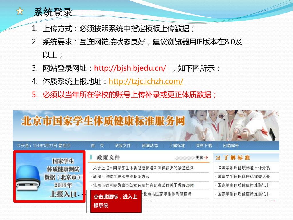 系统登录 • 上传方式:必须按照系统中指定模板上传数据; • 系统要求:互连网链接状态良好,建议浏览器用IE版本在8.0及以上; • 网站登录网址:http://bjsh.bjedu.cn/,如下图所示: • 体质系统上报地址:http://tzjc.ichzh.com/ • 必须以当年所在学校的账号上传补录或更正体质数据; 点击此图标,进入上报系统