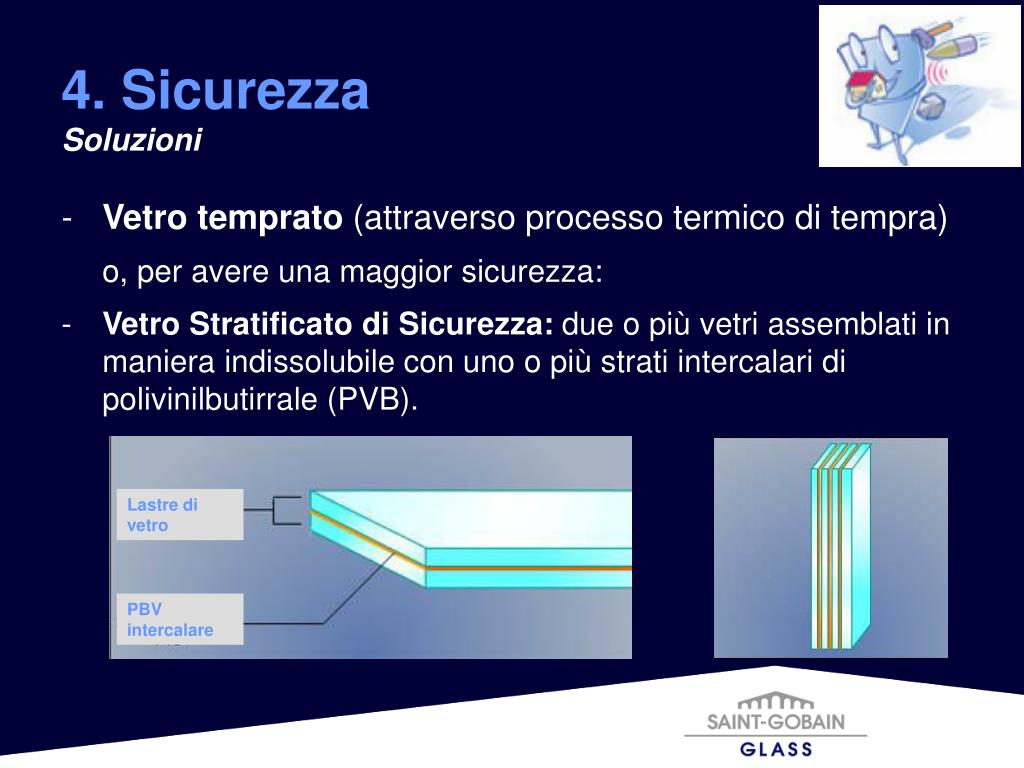 Vetro temprato I campi di applicazione sono molteplici. Per le sue prestazioni è spesso indispensabile e perfino obbligatorio. Tra le principali applicazioni: vetrate e controventature, tamponamenti di telai, porte interne ed esterne, box doccia, mobili in vetro,… Vetro stratificato antinfortunio Porte interne ed esterne, divisori, verande, tettoie, vetrine di negozi e in tutte le vetrate di ambienti aperti al pubblico quali ospedali, scuole, asili. Vetro stratificato antinfortunio/anti caduta Parapetti di balconi, terrazze, scale interne ed esterne, sottofinestre, protezioni per ascensori e montacarichi. 4. Sicurezza Applicazioni