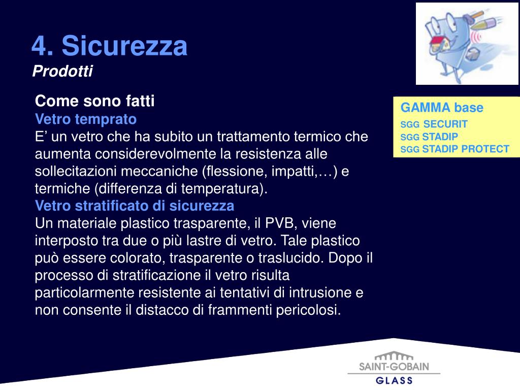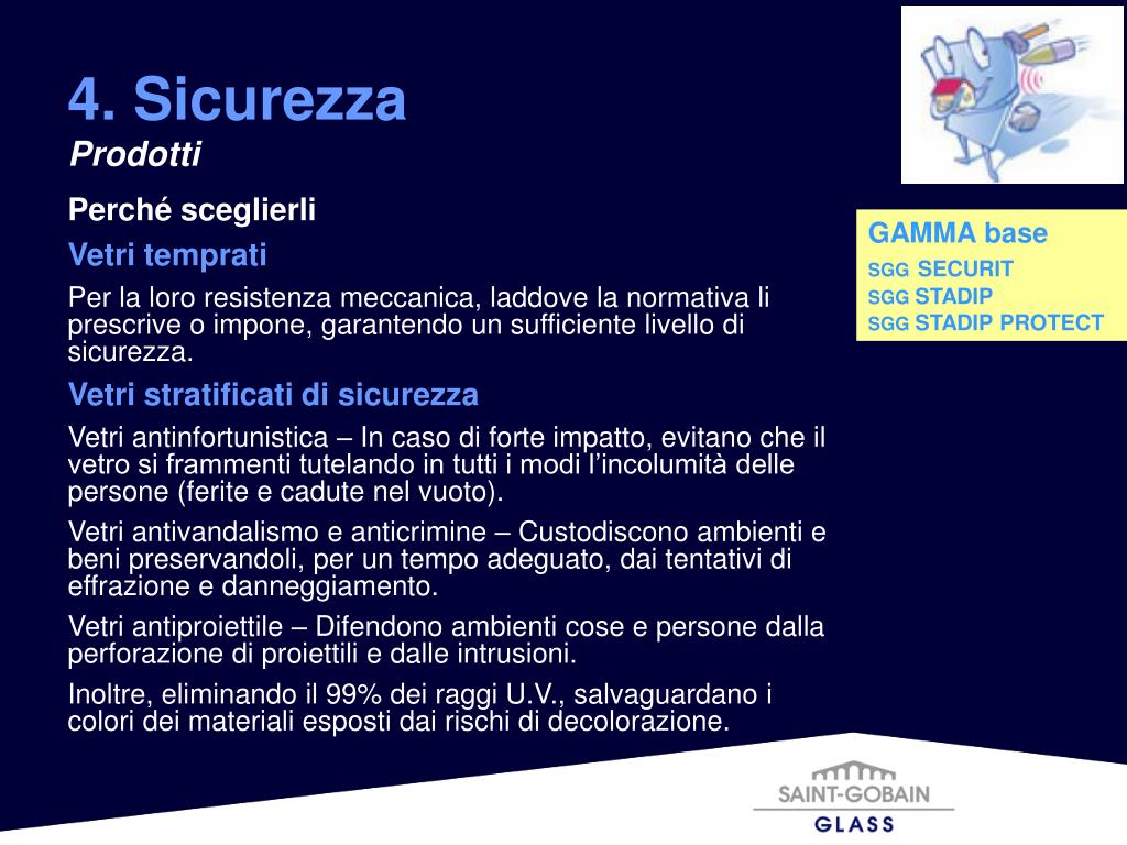 Perché sceglierli Vetri temprati Per la loro resistenza meccanica, laddove la normativa li prescrive o impone, garantendo un sufficiente livello di sicurezza. Vetri stratificati di sicurezza Vetri antinfortunistica – In caso di forte impatto, evitano che il vetro si frammenti tutelando in tutti i modi l’incolumità delle persone (ferite e cadute nel vuoto). Vetri antivandalismo e anticrimine – Custodiscono ambienti e beni preservandoli, per un tempo adeguato, dai tentativi di effrazione e danneggiamento. Vetri antiproiettile – Difendono ambienti cose e persone dalla perforazione di proiettili e dalle intrusioni. Inoltre, eliminando il 99% dei raggi U.V., salvaguardano i colori dei materiali esposti dai rischi di decolorazione. 4. Sicurezza Prodotti GAMMA base SGGSECURIT SGG STADIP SGG STADIP PROTECT