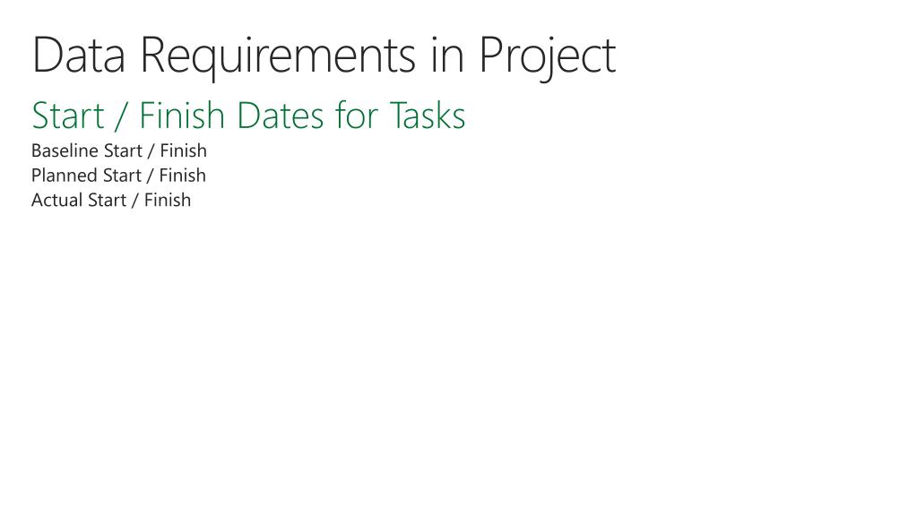 Data Requirements in Project Start / Finish Dates for Tasks Baseline Start / Finish Planned Start / Finish Actual Start / Finish