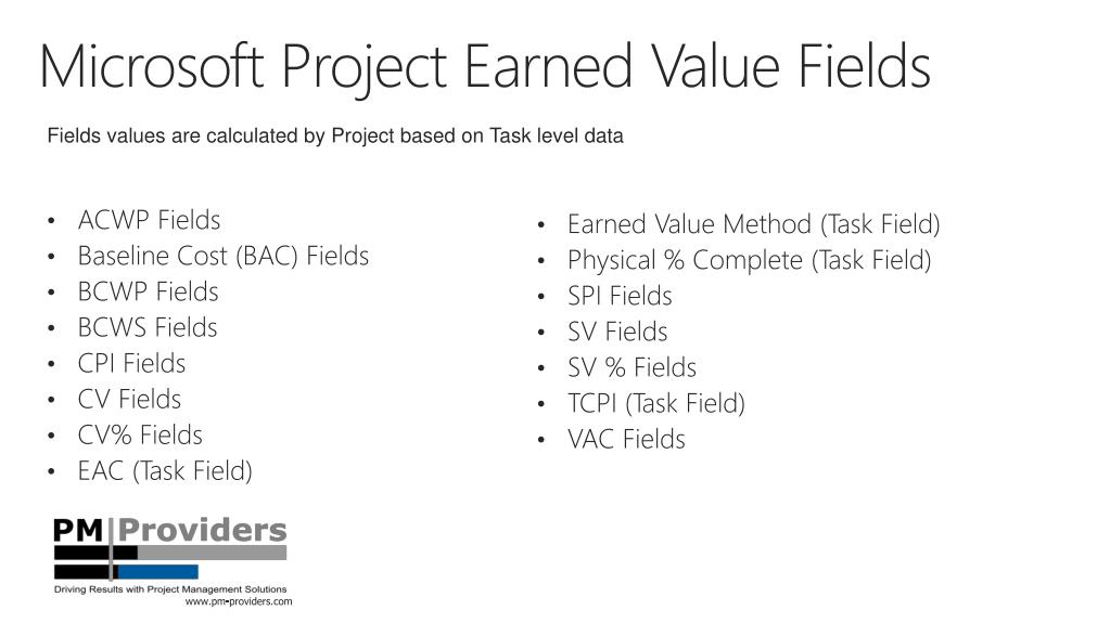 Microsoft Project Earned Value Fields • ACWP Fields • Baseline Cost (BAC) Fields • BCWP Fields • BCWS Fields • CPI Fields • CV Fields • CV% Fields • EAC (Task Field) Fields values are calculated by Project based on Task level data • Earned Value Method (Task Field) • Physical % Complete (Task Field) • SPI Fields • SV Fields • SV % Fields • TCPI (Task Field) • VAC Fields www.pm-providers.com