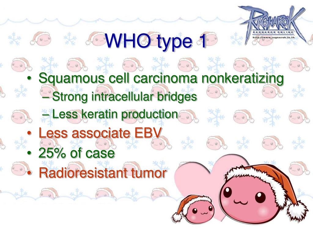 WHO type 1 • Squamous cell carcinoma nonkeratizing • Strong intracellular bridges • Less keratin production • Less associate EBV • 25% of case • Radioresistant tumor