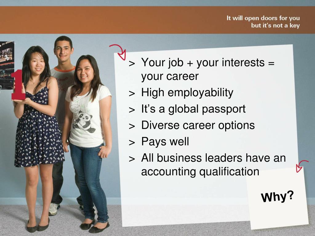> Your job + your interests = your career > High employability > It’s a global passport > Diverse career options > Pays well > All business leaders have an accounting qualification Why?