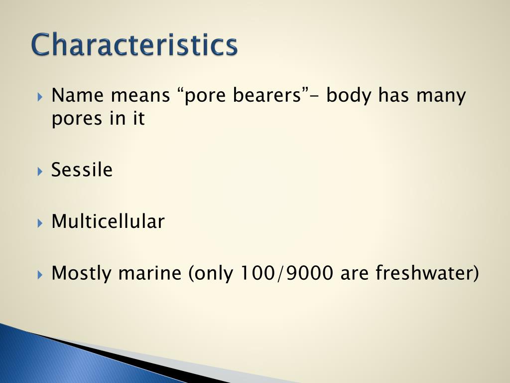 Characteristics • Name means “pore bearers”- body has many pores in it • Sessile • Multicellular • Mostly marine (only 100/9000 are freshwater)
