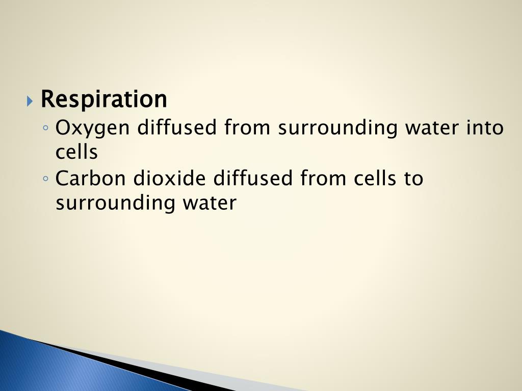 Respiration • Oxygen diffused from surrounding water into cells • Carbon dioxide diffused from cells to surrounding water