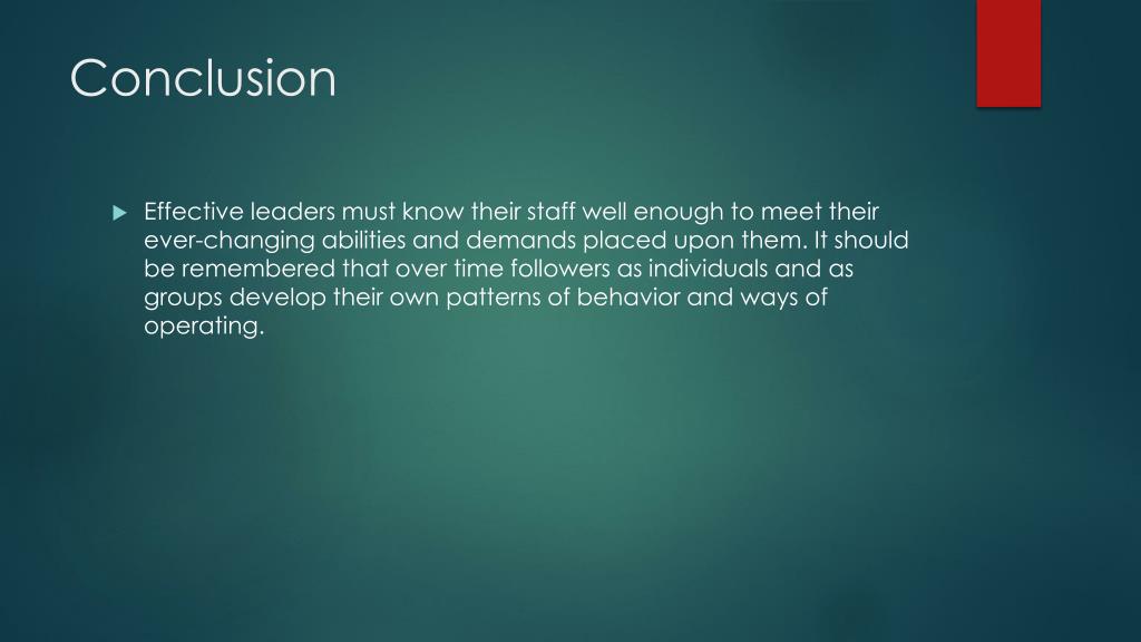 Conclusion • Effective leaders must know their staff well enough to meet their ever-changing abilities and demands placed upon them. It should be remembered that over time followers as individuals and as groups develop their own patterns of behavior and ways of operating.