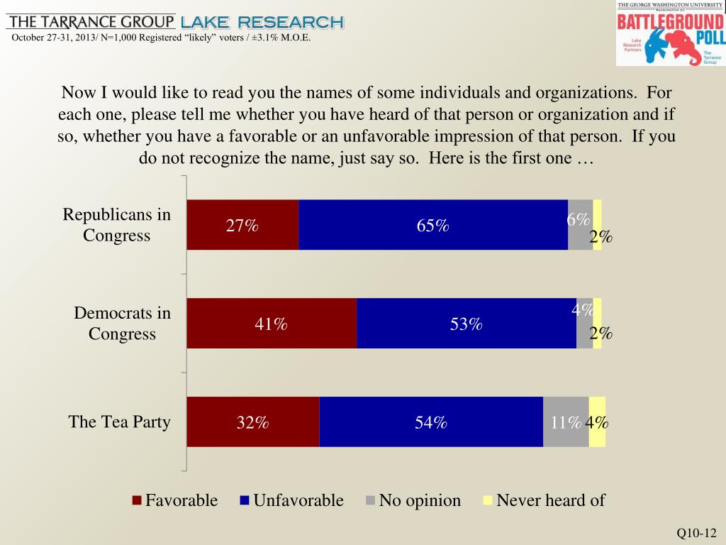 Now I would like to read you the names of some individuals and organizations. For each one, please tell me whether you have heard of that person or organization and if so, whether you have a favorable or an unfavorable impression of that person. If you do not recognize the name, just say so. Here is the first one … Q10-12