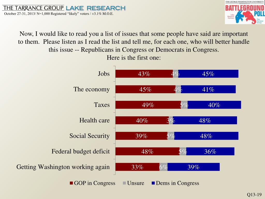 Now, I would like to read you a list of issues that some people have said are important to them. Please listen as I read the list and tell me, for each one, who will better handle this issue -- Republicans in Congress or Democrats in Congress. Here is the first one: Q13-19