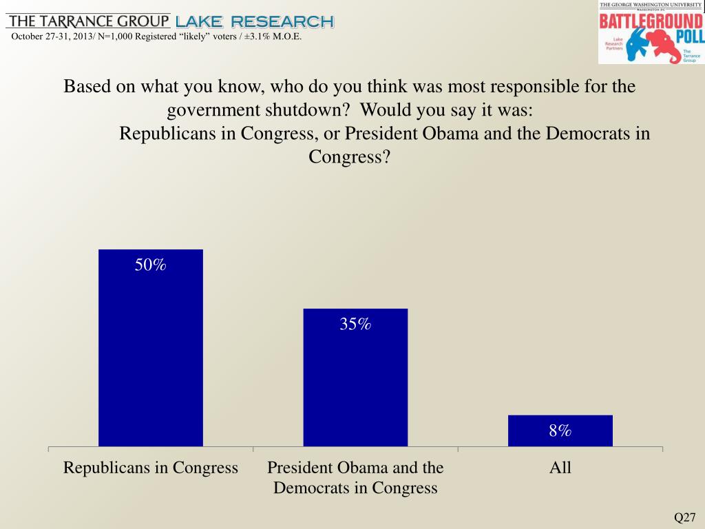 Based on what you know, who do you think was most responsible for the government shutdown? Would you say it was:Republicans in Congress, or President Obama and the Democrats in Congress? Q27