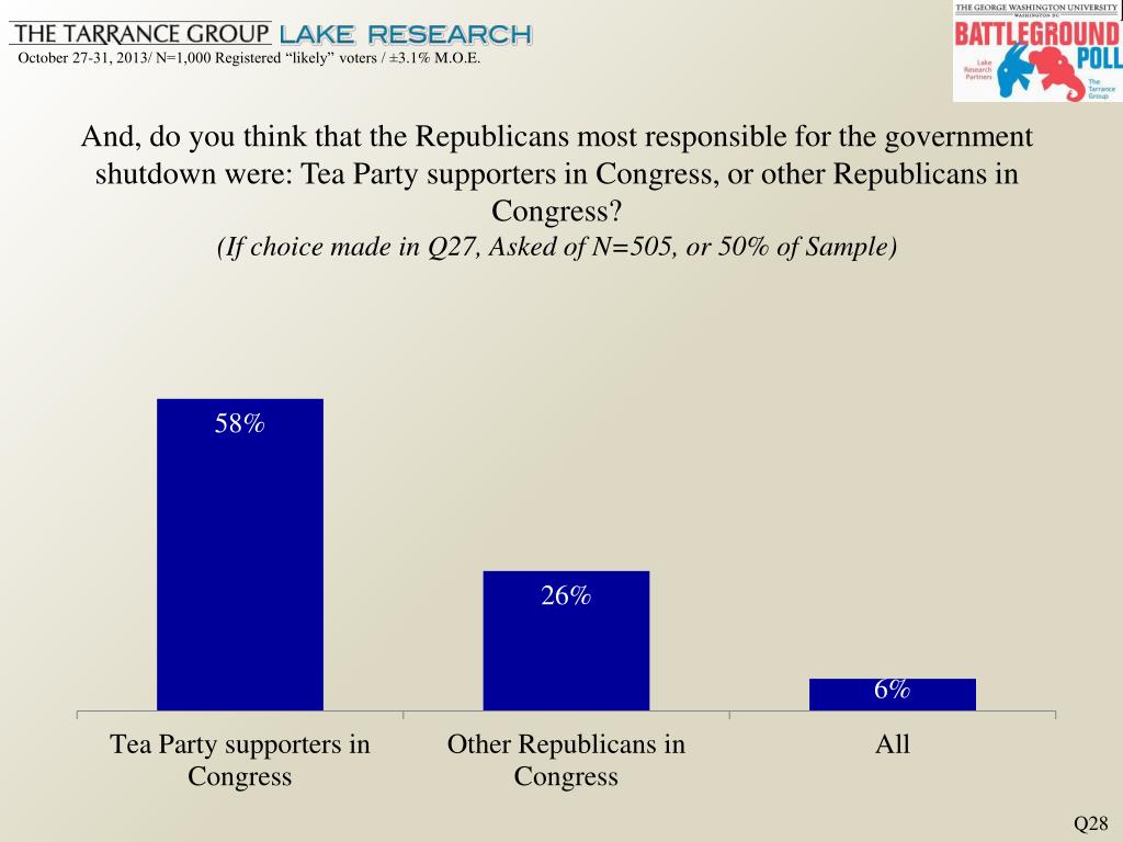 And, do you think that the Republicans most responsible for the government shutdown were: Tea Party supporters in Congress, or other Republicans in Congress?(If choice made in Q27, Asked of N=505, or 50% of Sample) Q28