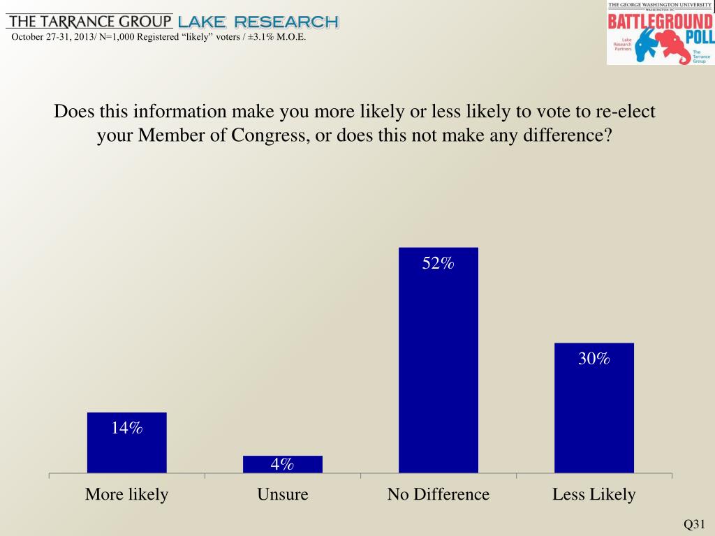 Does this information make you more likely or less likely to vote to re-elect your Member of Congress, or does this not make any difference? Q31