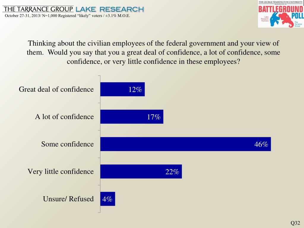 Thinking about the civilian employees of the federal government and your view of them. Would you say that you a great deal of confidence, a lot of confidence, some confidence, or very little confidence in these employees? Q32