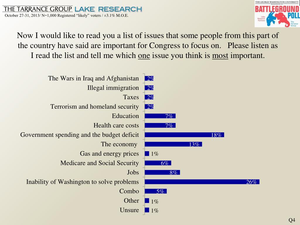 Now I would like to read you a list of issues that some people from this part of the country have said are important for Congress to focus on. Please listen as I read the list and tell me which one issue you think is most important. Q4