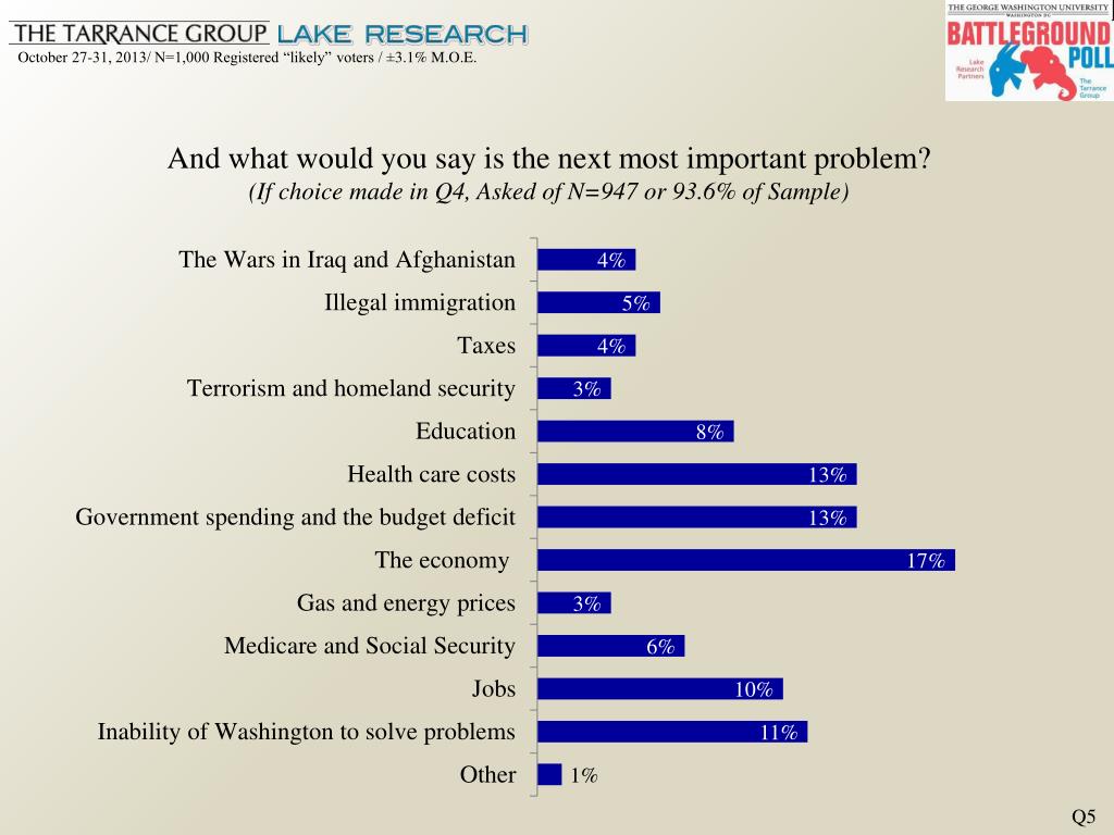 And what would you say is the next most important problem?(If choice made in Q4, Asked of N=947 or 93.6% of Sample) Q5