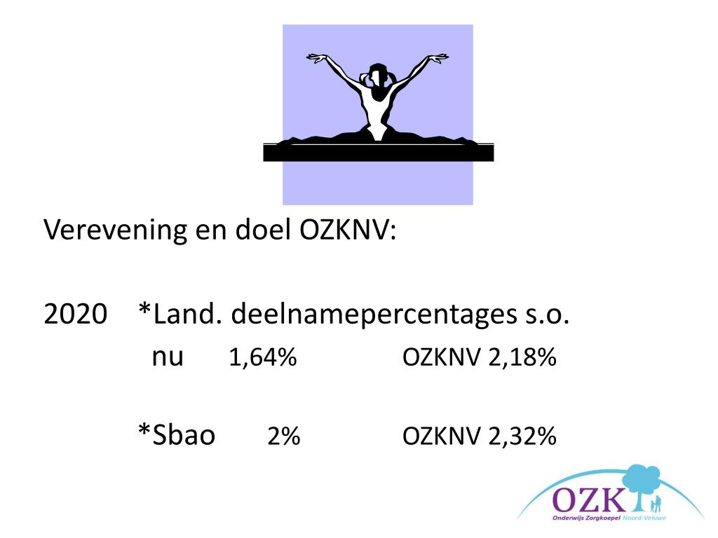 Verevening en doel OZKNV: • *Land. deelnamepercentages s.o. nu 1,64% OZKNV 2,18% *Sbao2% OZKNV 2,32%