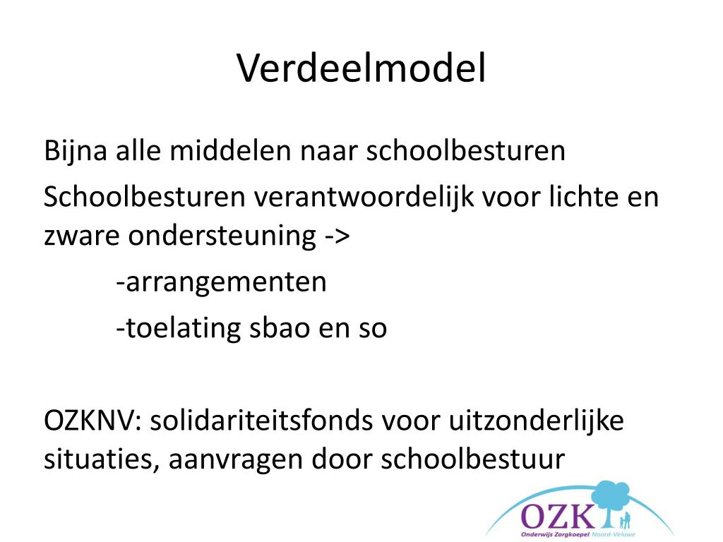 Verdeelmodel Bijna alle middelen naar schoolbesturen Schoolbesturen verantwoordelijk voor lichte en zware ondersteuning -> -arrangementen -toelating sbao en so OZKNV: solidariteitsfonds voor uitzonderlijke situaties, aanvragen door schoolbestuur