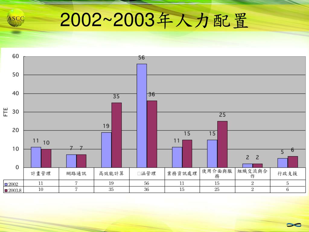 ASCC Support and Services • A simple CPU cycle provider can no longer meet user need • A need to work with researchers in • Customizing the existing application programs for target computing system • Enabling and optimization • Managing data • Parallelization of long running programs • Developing suitable computing method and numerical algorithm • Developing new application programs/systems • A need to understand user's domain knowledge in a certain degrees • A need to constant update advanced computing technologies