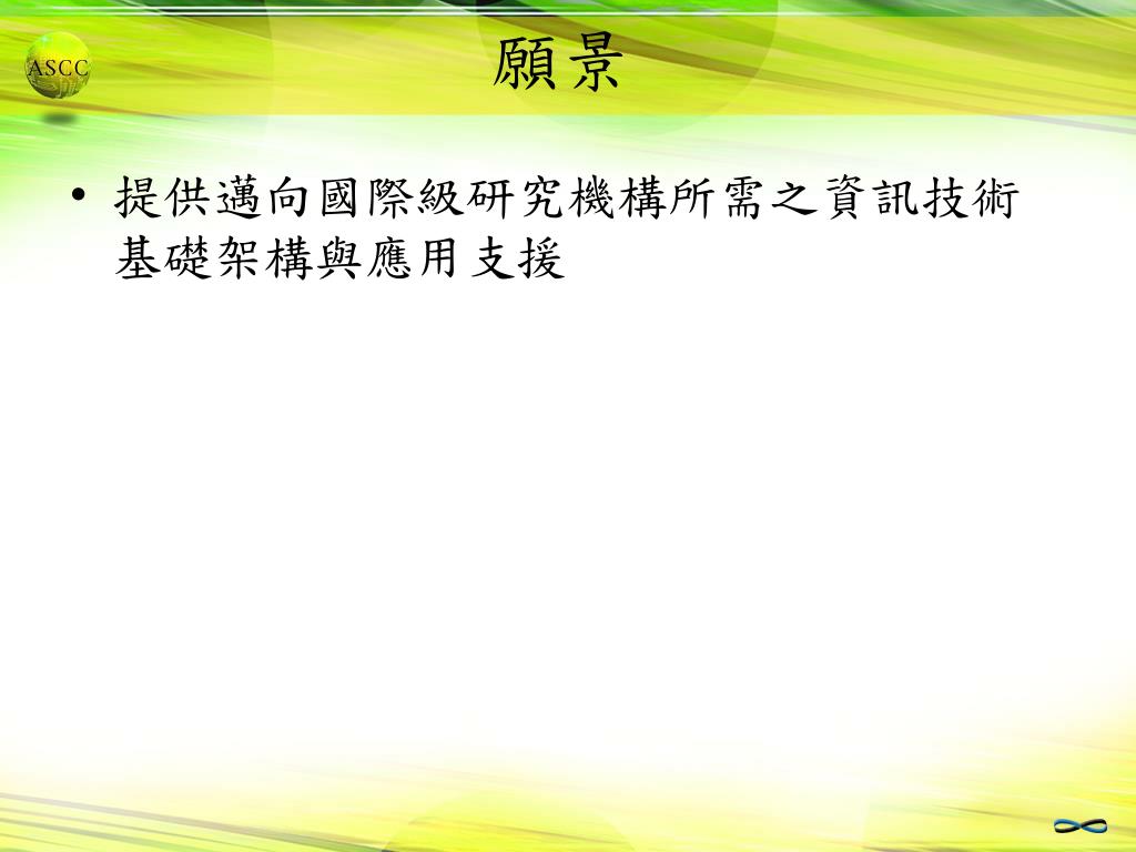 提供穩定有效的資訊技術基礎架構 • 目標 • 先進規畫(質與量兼顧) • 安全穩定 • 維持最大可擴充性與彈性 • 執行重點 • 持續擴展網路通訊基礎建設 • 發展可靠的 middleware 基礎架構 (directory service, workflow mgnt, account mgnt, & Grid, etc) • 發展強固的資訊安全基礎架構 • 提供易於使用的計算環境與適當的計算資源