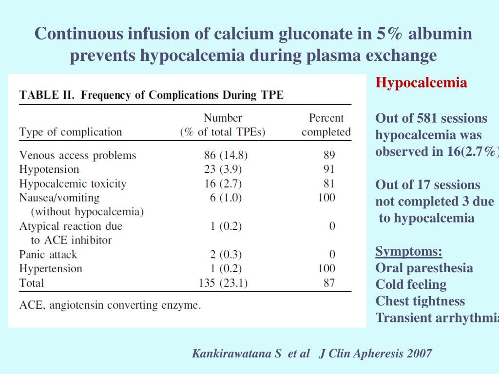 Continuous infusion of calcium gluconate in 5% albumin prevents hypocalcemia during plasma exchange Hypocalcemia Out of 581 sessions hypocalcemia was observed in 16(2.7%) Out of 17 sessions not completed 3 due to hypocalcemia Symptoms: Oral paresthesia Cold feeling Chest tightness Transient arrhythmia Kankirawatana S et al J ClinApheresis 2007