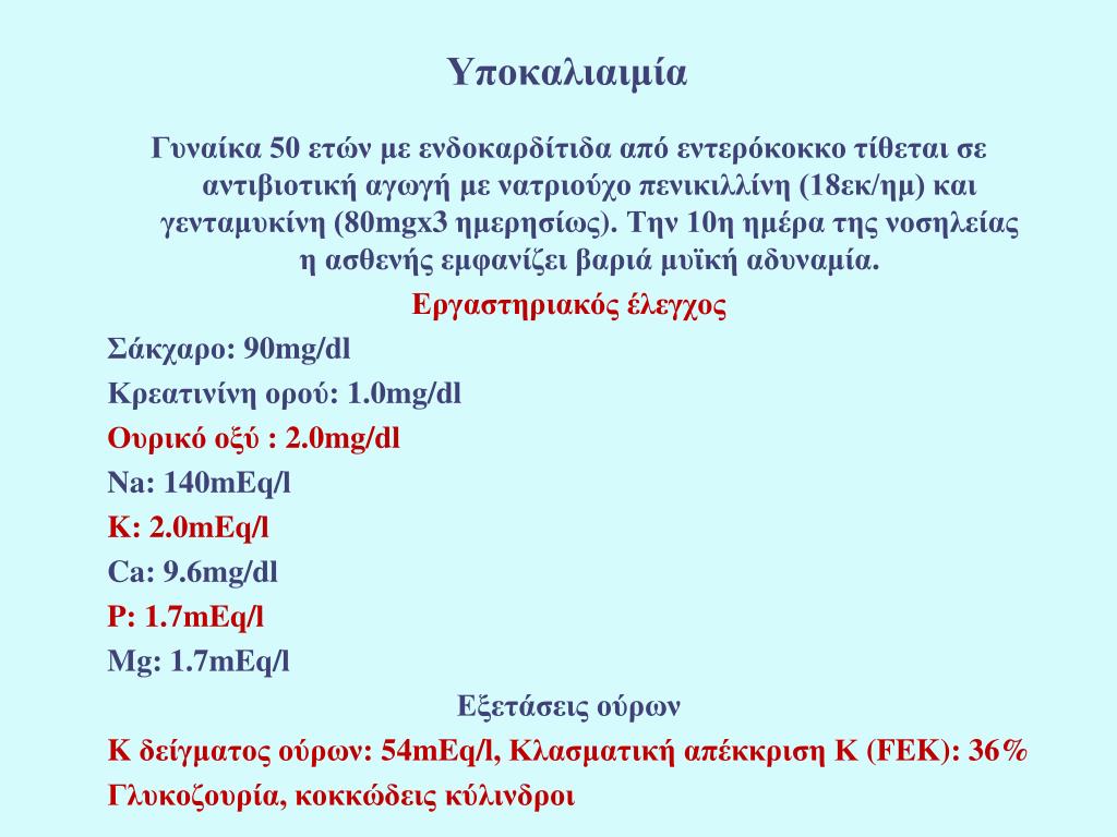 Υποκαλιαιμία Γυναίκα 50 ετών με ενδοκαρδίτιδα από εντερόκοκκο τίθεται σε αντιβιοτική αγωγή με νατριούχο πενικιλλίνη (18εκ/ημ) και γενταμυκίνη (80mgx3 ημερησίως). Την 10η ημέρα της νοσηλείας η ασθενής εμφανίζει βαριά μυϊκή αδυναμία. Εργαστηριακός έλεγχος Σάκχαρο: 90mg/dl Κρεατινίνη ορού: 1.0mg/dl Ουρικό οξύ : 2.0mg/dl Na: 140mEq/l K: 2.0mEq/l Ca: 9.6mg/dl P: 1.7mEq/l Mg: 1.7mEq/l Εξετάσεις ούρων K δείγματος ούρων: 54mEq/l,Κλασματική απέκκριση Κ (FEK): 36% Γλυκοζουρία, κοκκώδεις κύλινδροι