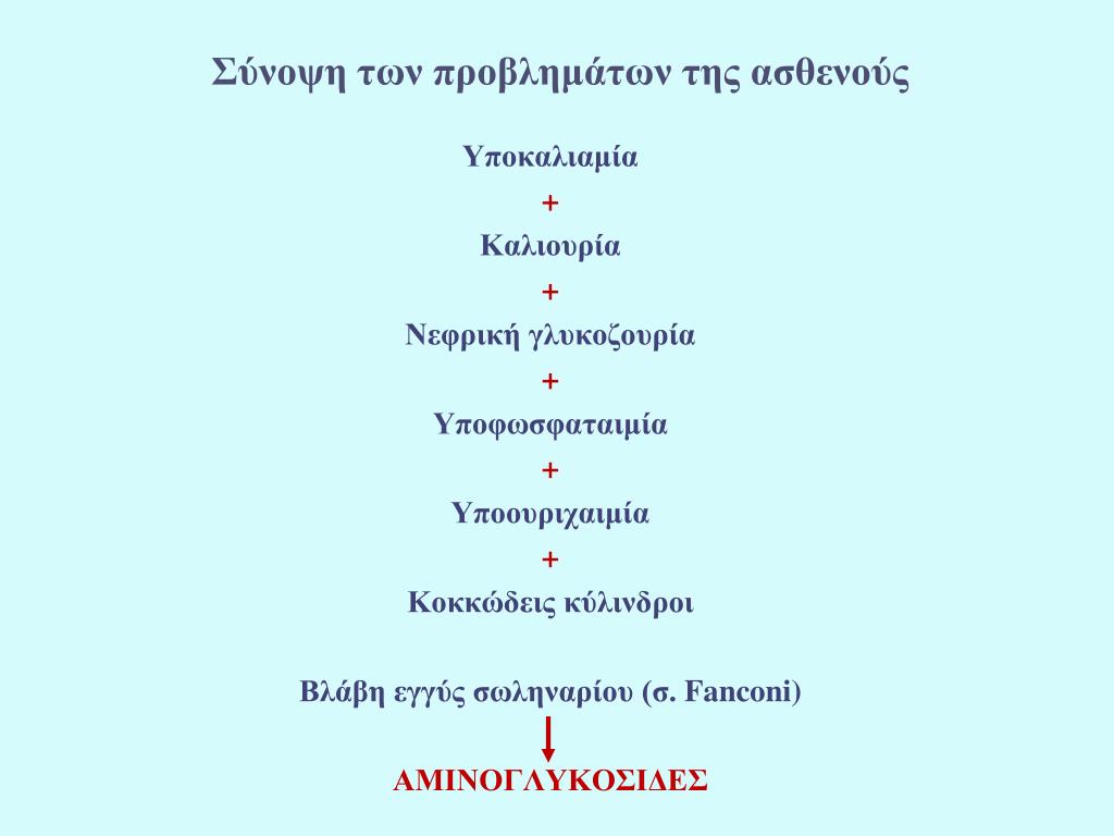Σύνοψη των προβλημάτων της ασθενούς Υποκαλιαμία + Καλιουρία + Νεφρική γλυκοζουρία + Υποφωσφαταιμία + Υποουριχαιμία + Κοκκώδεις κύλινδροι Βλάβη εγγύς σωληναρίου (σ. Fanconi) ΑΜΙΝΟΓΛΥΚΟΣΙΔΕΣ
