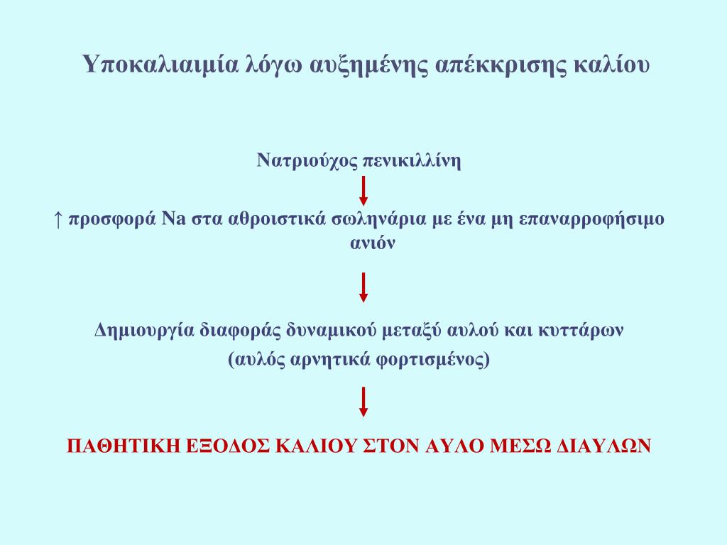Υποκαλιαιμία λόγω αυξημένης απέκκρισης καλίου Νατριούχος πενικιλλίνη ↑ προσφορά Na στα αθροιστικά σωληνάρια με ένα μη επαναρροφήσιμο ανιόν Δημιουργία διαφοράς δυναμικού μεταξύ αυλού και κυττάρων (αυλός αρνητικά φορτισμένος) ΠΑΘΗΤΙΚΗ ΕΞΟΔΟΣ ΚΑΛΙΟΥ ΣΤΟΝ ΑΥΛΟ ΜΕΣΩ ΔΙΑΥΛΩΝ
