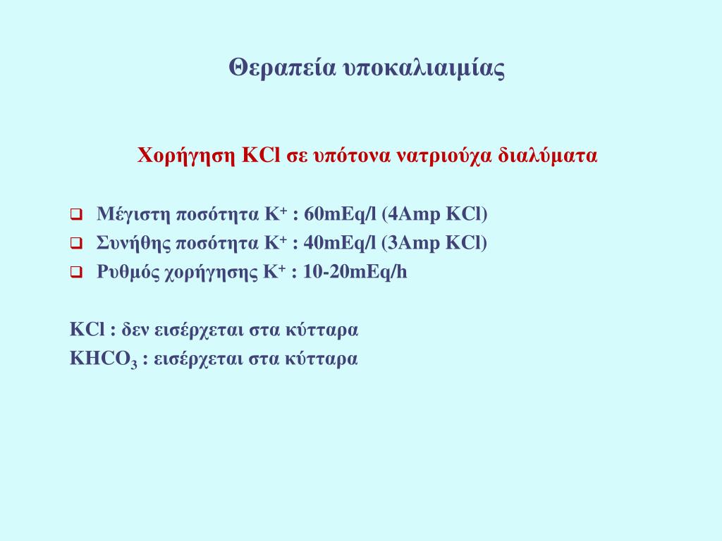 Θεραπεία υποκαλιαιμίας Χορήγηση KCl σε υπότονα νατριούχα διαλύματα • Μέγιστη ποσότητα Κ+: 60mEq/l(4Amp KCl) • Συνήθης ποσότητα Κ+: 40mEq/l (3Amp KCl) • Ρυθμός χορήγησης Κ+: 10-20mEq/h KCl : δεν εισέρχεται στα κύτταρα KHCO3 : εισέρχεται στα κύτταρα