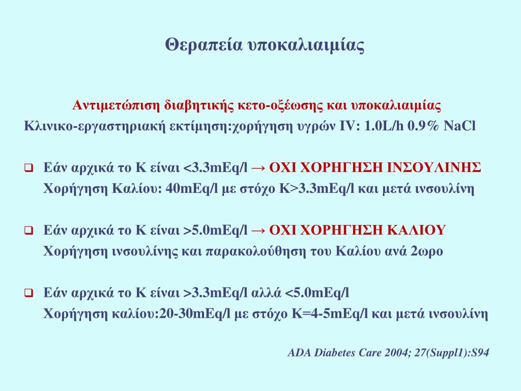 Θεραπεία υποκαλιαιμίας Αντιμετώπιση διαβητικής κετο-οξέωσης και υποκαλιαιμίας Κλινικο-εργαστηριακή εκτίμηση:χορήγηση υγρών IV: 1.0L/h 0.9% NaCl • Εάν αρχικά το Κ είναι <3.3mEq/l → ΟΧΙ ΧΟΡΗΓΗΣΗ ΙΝΣΟΥΛΙΝΗΣ Χορήγηση Καλίου: 40mEq/l με στόχο Κ>3.3mEq/l και μετά ινσουλίνη • Εάν αρχικά το Κ είναι >5.0mEq/l → ΟΧΙ ΧΟΡΗΓΗΣΗ ΚΑΛΙΟΥ Χορήγηση ινσουλίνης και παρακολούθηση του Καλίου ανά 2ωρο • Εάν αρχικά το Κ είναι >3.3mEq/l αλλά <5.0mEq/l Χορήγηση καλίου:20-30mEq/l με στόχο Κ=4-5mEq/l και μετά ινσουλίνη ADA Diabetes Care 2004; 27(Suppl1):S94