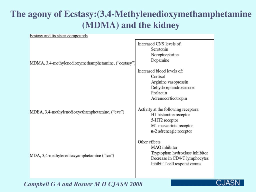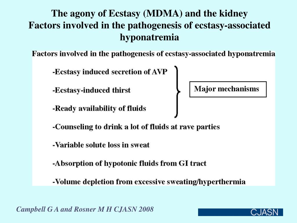 The agony of Ecstasy (MDMA) and the kidney Factors involved in the pathogenesis of ecstasy-associated hyponatremia Campbell G A and Rosner M H CJASN 2008