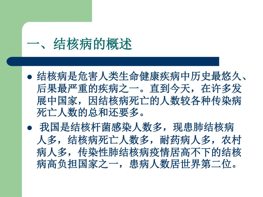肺结核病防治基本知识. 庄浪县疾病预防控制中心结防所. 一、结核病的概述. 结核病是危害人类生命健康疾病中历史最悠久、后果最严重的疾病之一。直到今天,在许多发展中国家,因结核病死亡的人数较各种传染病死亡人数的总和还要多。 我国是结核杆菌感染人数多,现患肺结核病人多,结核病死亡人数多,耐药病人多,农村病人多,传染性肺结核病疫情居高不下的结核病高负担国家之一,患病人数居世界第二位。. 1.1 结核病的危害. 结核病是人类历史上危害最严重的疾病之一; 结核病是穷人的疾病,使穷人更穷; 高患病率、高死亡率给社会造成沉重负担,制约社会生产力的发展;