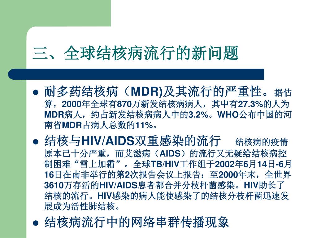 三、全球结核病流行的新问题 • 耐多药结核病(MDR)及其流行的严重性。据估算,2000年全球有870万新发结核病病人,其中有27.3%的人为MDR病人,约占新发结核病病人中的3.2%。WHO公布中国的河南省MDR占病人总数的11%。 • 结核与HIV/AIDS双重感染的流行 结核病的疫情原本已十分严重,而艾滋病(AIDS)的流行又无疑给结核病控制困难“雪上加霜”。全球TB/HIV工作组于2002年6月14日-6月16日在南非举行的第2次报告会议上报告:至2000年末,全世界3610万存活的HIV/AIDS患者都合并分枝杆菌感染。HIV助长了结核的流行。HIV感染的病人能使感染了的结核分枝杆菌迅速发展成为活性肺结核。 • 结核病流行中的网络串群传播现象