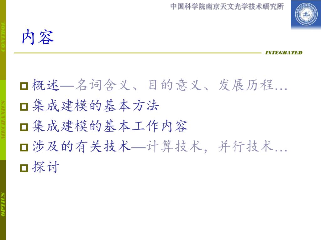 内容 • 概述—名词含义、目的意义、发展历程… • 集成建模的基本方法 • 集成建模的基本工作内容 • 涉及的有关技术—计算技术,并行技术… • 探讨