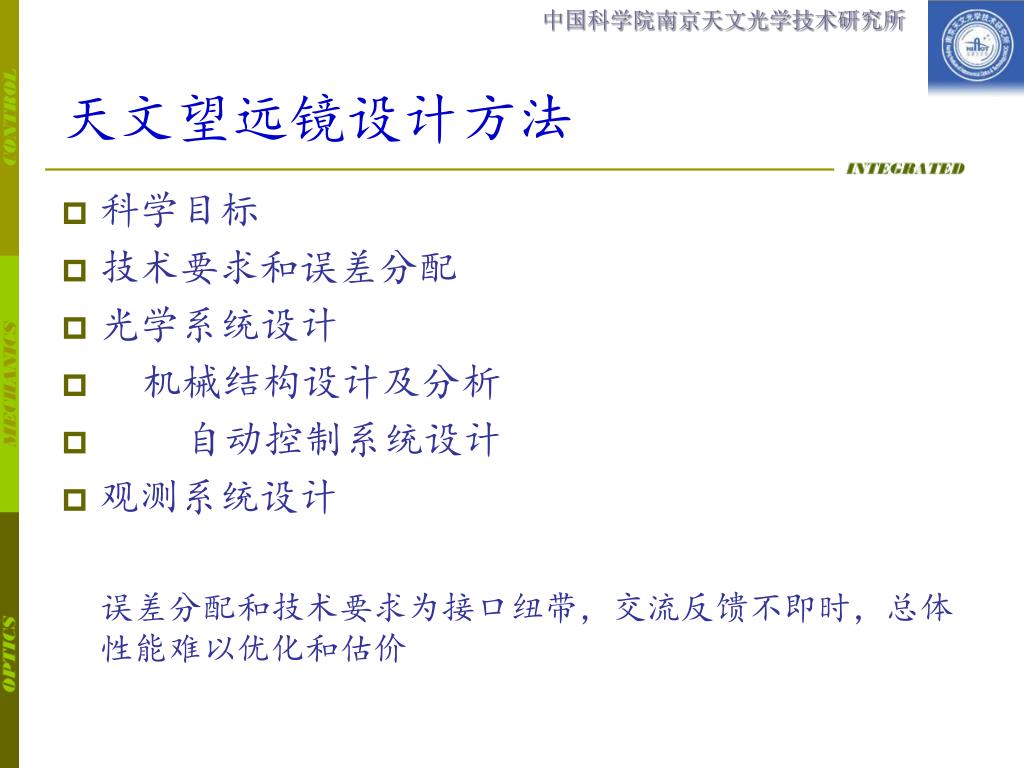 中国科学院 南京天文光学技术研究所. 天文望远镜集成建模研究. 杨德华 南京天文光学技术研究所 30 NOV, 2006 2006 年中国虚拟天文台年会 广西师范大学 桂林. 内容. 概述 — 名词含义、目的意义、发展历程 … 集成建模的基本方法 集成建模的基本工作内容 涉及的有关技术 — 计算技术,并行技术 … 探讨. 天文望远镜设计方法. 科学目标 技术要求和误差分配 光学系统设计 机械结构设计及分析 自动控制系统设计 观测系统设计 误差分配和技术要求为接口纽带,交流反馈不即时,总体性能难以优化和估价.