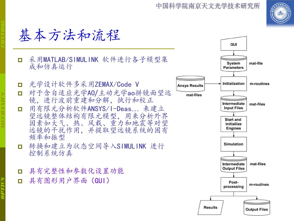 基本方法和流程 • 采用MATLAB/SIMULINK 软件进行各子模型集成和仿真运行 • 光学设计软件多采用ZEMAX/Code V • 对于含自适应光学AO/主动光学ao拼镜面望远镜,进行波前重建和分解,执行和校正 • 用有限元分析软件ANSYS/I-Deas…来建立望远镜整体结构有限元模型,用来分析外界因素如大气、热、风载、重力和地震等对望远镜的干扰作用,并提取望远镜系统的固有频率和振型 • 转换和建立为状态空间导入SIMULINK 进行控制系统仿真 • 具有完整性和参数化设置功能 • 具有图形用户界面(GUI)