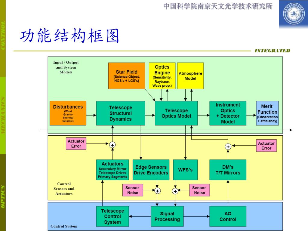 Motivation & Benefit • 在项目执行较早的阶段即可评价望远镜工作性能,直到项目结束 • 识别影响系统性能的关键因素 • 从系统层面上来优化和平衡各子系统的设计 • 从系统层面上来权衡和克服各种干扰因素 • 寻求更有效的提升望远镜性能的方法,优化设计方案 集成化模型仿真可较真实有效地进行望远镜设计方案整体性能造价评估和方便迅速地进行优化改进。