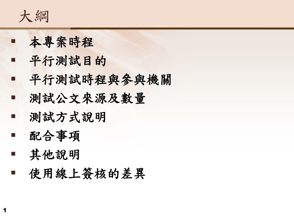 大綱 • 本專案時程 • 平行測試目的 • 平行測試時程與參與機關 • 測試公文來源及數量 • 測試方式說明 • 配合事項 • 其他說明 • 使用線上簽核的差異