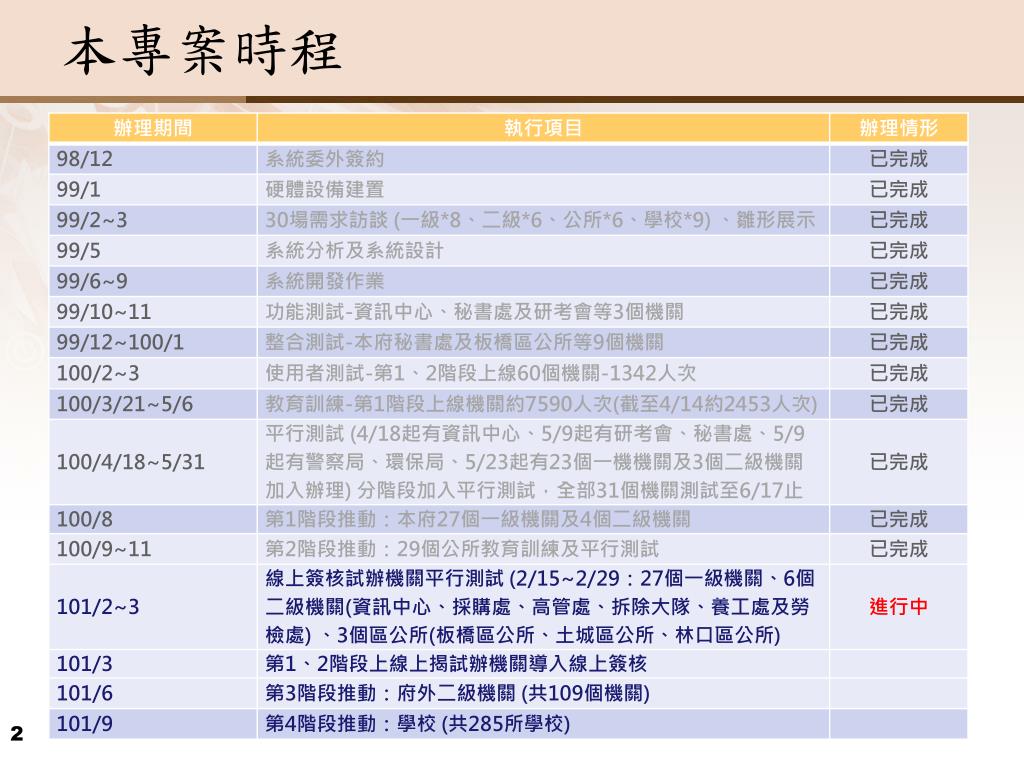 平行測試時程與參與機關 • 101年2月15日~101年2月29日。 • 參與機關如下: • 一級機關:27個 • 二級機關:6個(資訊中心、採購處、高管處、拆除大隊、養工處及勞檢處) • 區公所:3個(板橋、土城、林口)